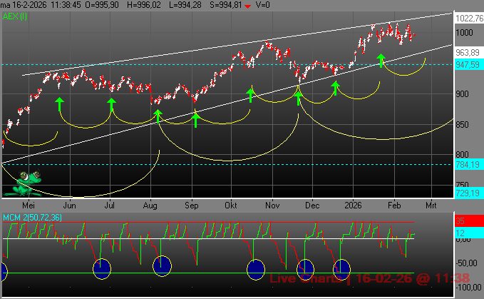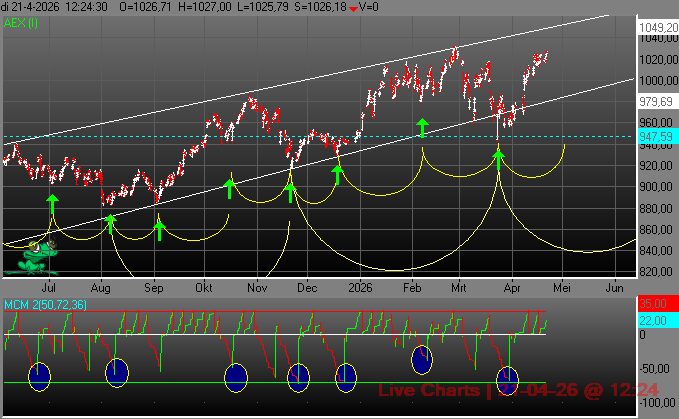 Beursanalist en optiehandelaar Koen Hoefgeest analyseert de AEX-index op basis van het door hem in de jaren’90 van de vorige eeuw ontwikkelde fractale cyclus-concept.